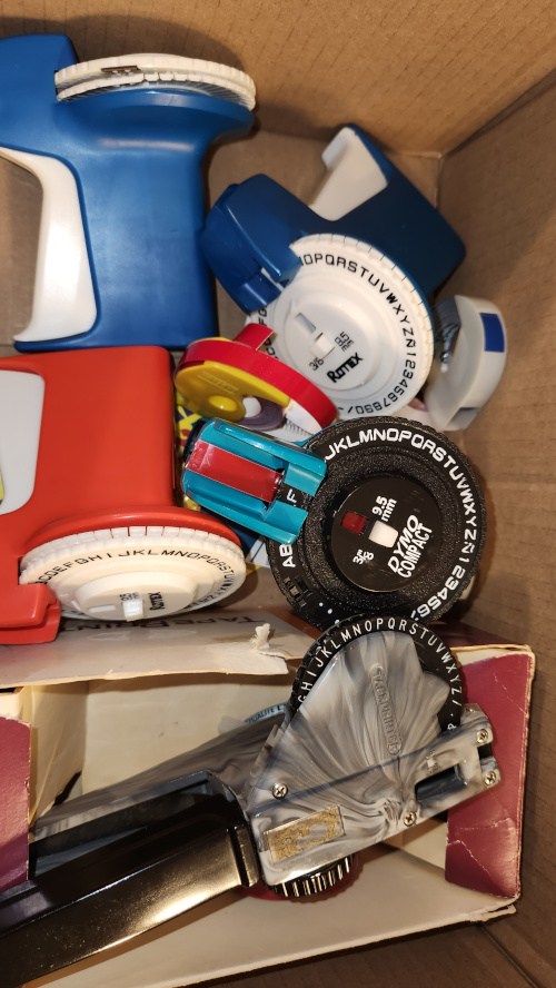 So I got a bunch of old-style embossing tape label makers from Ebay and will soon be working on the label making site under my consumerist shrine page.